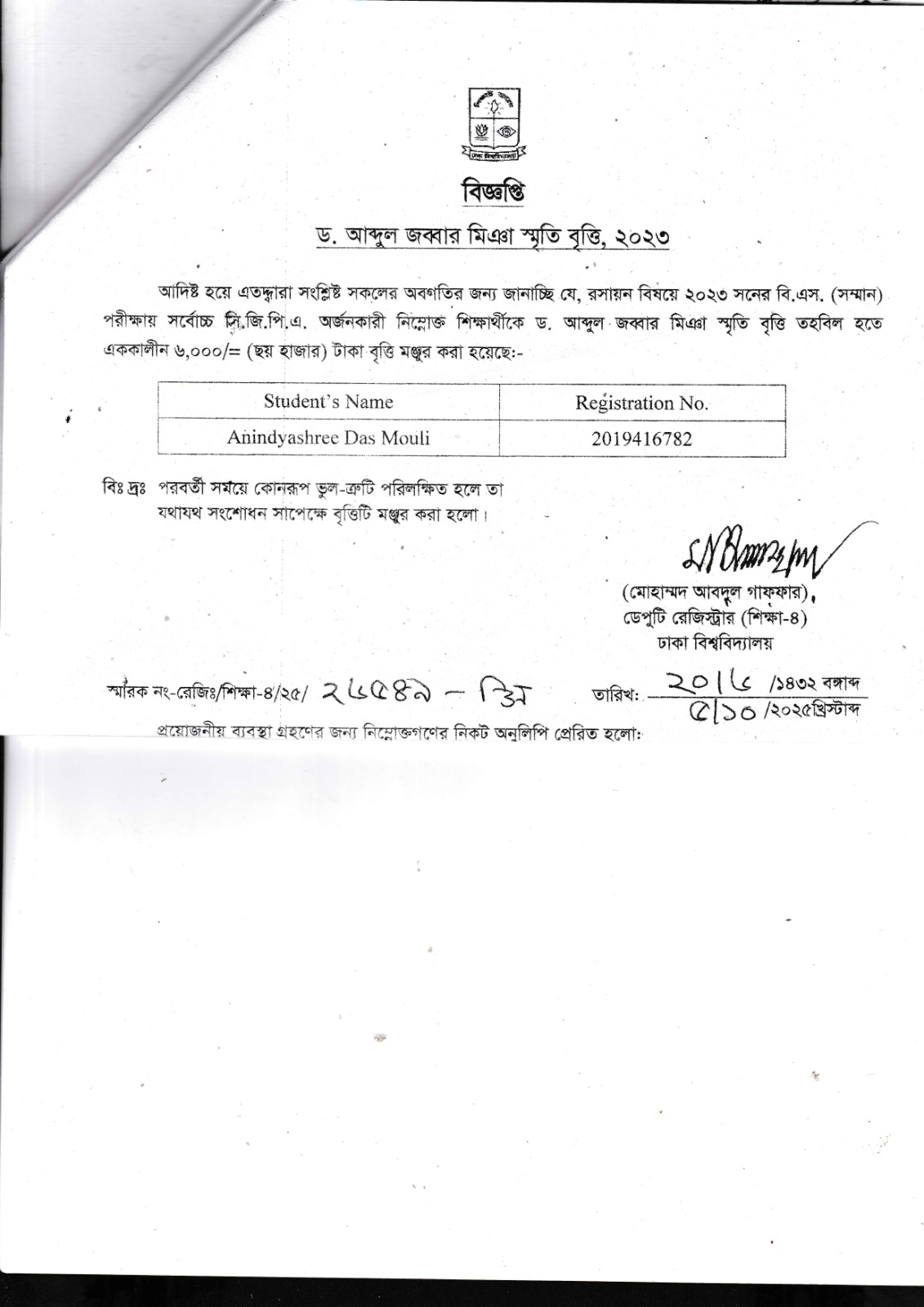 ডুয়া ডেস্ক: ঢাকা বিশ্ববিদ্যালয় রসায়ন বিভাগের ২০২৩ সালের বি.এস. (সম্মান) পরীক্ষায় সর্বোচ্চ সি.জি.পি.এ. অর্জনকারী অনিন্দ্যশ্রী দাস মৌলি কে ড. আব্দুল জব্বার মিঞা স্মৃতি তহবিল থেকে এককালীন ৬,০০০ টাকা বৃত্তি দেওয়া হবে।