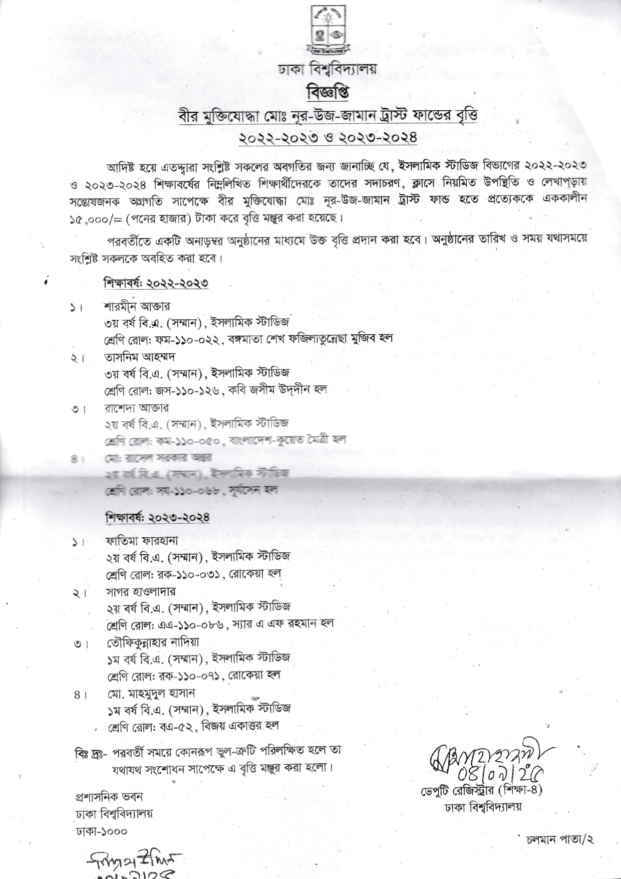 বিজ্ঞপ্তিতে বলা হয়েছে, ইসলামিক স্টাডিজ বিভাগের ২০২২-২০২৩ ও ২০২৩-২০২৪ শিক্ষাবর্ষের নিম্নলিখিত শিক্ষার্থীদেরকে তাদের সাধারণ, স্বহস্তে নিয়মিত উপস্থিতি ও লেখাপড়ায় সন্তোষজনক অগ্রগতি সাপেক্ষে বীর মুক্তিযোদ্ধা মোঃ নূর-উজ-জামান ট্রাস্ট ফান্ড হতে প্রত্যেককে এককালীন ১৫,০০০/- (পনের হাজার) টাকা করে বৃত্তি মঞ্জুর করা হয়েছে।