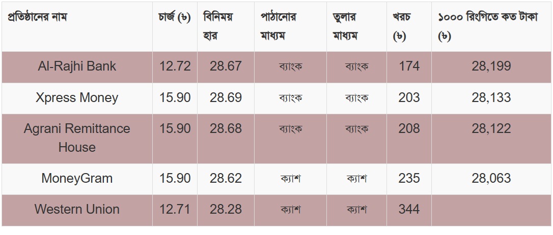 একনজরে আজকের রিংগিত রেট তুলনা (১০০০ রিংগিতে কত টাকা পাবেন)
