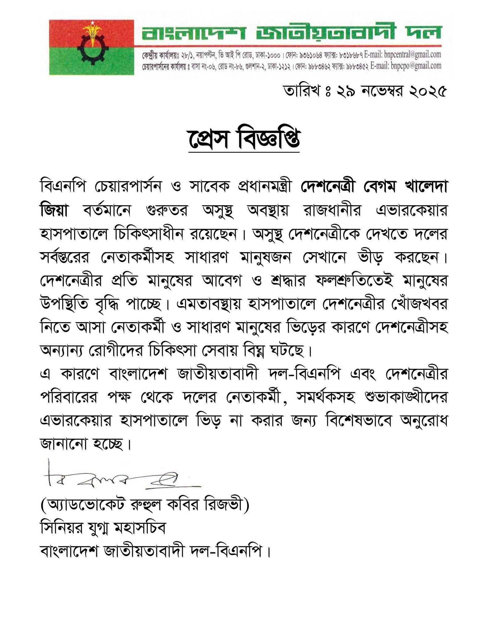বিজ্ঞপ্তিতে জানানো হয়, বেগম খালেদা জিয়া বর্তমানে গুরুতর অসুস্থ অবস্থায় রাজধানীর এভারকেয়ার হাসপাতালে চিকিৎসাধীন রয়েছেন। দেশনেত্রীর প্রতি আবেগ ও শ্রদ্ধার কারণে দলের সর্বস্তরের নেতাকর্মীসহ সাধারণ মানুষ তাঁকে দেখতে হাসপাতালে ভিড় করছেন।