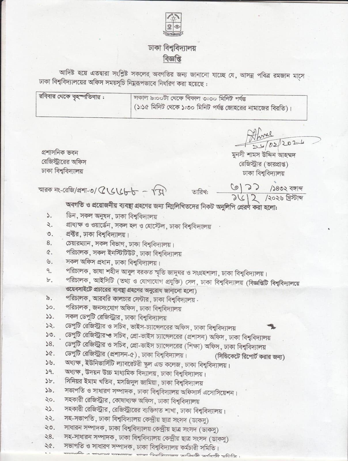 নিজস্ব প্রতিবেদক: আসন্ন পবিত্র রমজান মাস উপলক্ষে ঢাকা বিশ্ববিদ্যালয়ের (ঢাবি) অফিসসমূহের জন্য নতুন সময়সূচি নির্ধারণ করা হয়েছে। ১৬ ফেব্রুয়ারি ২০২৬ (সোমবার) বিশ্ববিদ্যালয়ের রেজিস্ট্রার (ভারপ্রাপ্ত) মুন্সী শামস উদ্দিন আহমদ স্বাক্ষরিত এক বিজ্ঞপ্তিতে এই নতুন সময়সূচির কথা জানানো হয়।